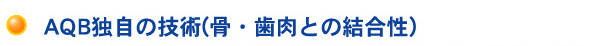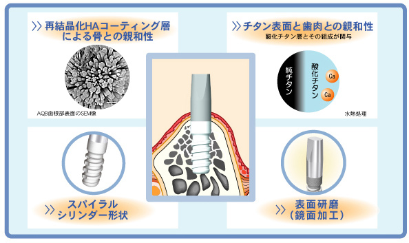 AQBインプラントは、当社独自の特許製法(国内外特許)を駆使し、優れた生体親和性と早期の骨癒合、長期安定性に大きく貢献するインプラントシステムです。