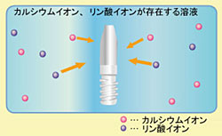 2. 水熱処理AQBインプラントをカルシウムイオン、リン酸イオンが存在する溶液中に浸漬します。 チタンは水熱処理によって酸化が進行し、同時にチタン表面にカルシウムイオン、リン酸イオンが侵入・拡散します。 |