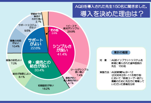 「インプラント導入を考えているが、何を決め手にすればいいの?」こんなドクターの声を聞くことがあります。そこで今回は、これからインプラントを導入される先生にAQBインプラントシステムを既に導入していただいた先生150名の『AQBを導入した理由』をお伝えします。