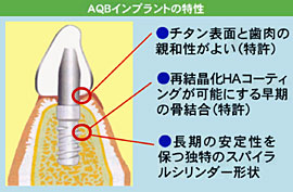 AQBインプラントの特性を簡単にまとめたのが右の図です。歯根部の再結晶化HAコーティングによる早期の骨結合の実現、支台部の表面研磨と水熱処理による歯肉との高い生態親和性、独特のシリンダー形状による高い応力など、AQBは最先端の技術開発力を駆使し、他に類をみない優れたインプラントを実現しました。