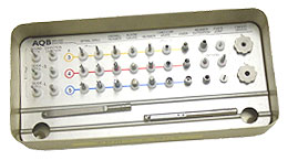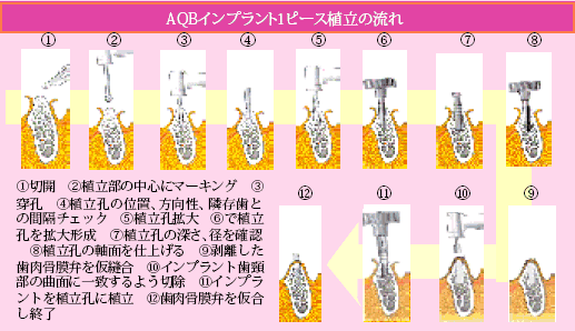 下は、AQB1ピースインプラント植立の術式の流れとツール写真です。他メーカーのツールをご覧になった先生は、AQBのツールの数が圧倒的に少ないことにお気付きでしょう。AQBは1ピースゆえにオペが1回で済むのが大きな特長です。ツールも最小限の数で、最大限の効果が発揮できるように考えられており、適応症例が広いのが自慢です。また使用するインプラントの径による色分けもAQBが業界で始めて導入しました。