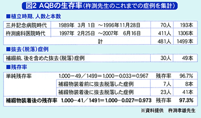 寳田 ただし、注意すべき点は、成功率の基準をどうするかということと、症例の追跡がどこまでできるかということですね。 AQBに関しては短期の結果しかでていないので、ユーザーのためにもぜひ長期の成功率の報告が欲しいですね。 これまで私が行ってきた症例では95%前後の成功率ではないかと思われます。 以前、単独植立のデータを調べて学会で報告したことがありますが、約30症例、すべて予後良好という結果でした。