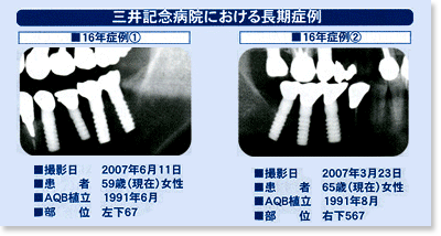 津山 1987年11月17日、三井記念病院では治験のための第一回植立オペが行われました。 寳田先生が前歯に6本の3MLを植立した症例ですが、現在も患者さんのパントモを見ると、予後良好であることが分かります。 三井記念病院で行われた症例については現在、治験段階からのものを含めて追跡調査を進めているところです。 20年近く経て住所が不明になってしまった患者さんなどを抜いて、現存の症例から見た予後は非常に良好で、生存率もかなりの高い数字がでると思います。