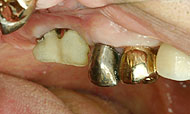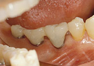 2)単独植立で近くに動揺のない隣在天然歯がある場合: 隣在天然歯の表面にエナメル質や象牙質があり、光重合用ボンディング剤で表面に安定したレジン皮膜を作れるなら、前述した簡便法で連結固定できる。隣在天然歯が全部被覆冠の場合、咬合面以外の大半の表面をツヤ消しにすれば、前述した簡便法で連結固定できる。メタルプライマーやポーセレンプライマーを使いシランカップリング処理してからボンディング剤を使えばより強固な接着が期待できる。