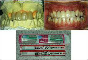 ![]() ?抜糸の2~3日後から術後用スーパーソフトブラシでブラッシングを再開、術後3~4週後には通常のブラシに戻って磨いてもらう。ブラッシングにより暫間被覆冠周囲の粘膜を十分引き締め、術後2ヵ月後に形成印象を行う。印象後はTek内外面に即重レジンを盛り、最終Crに近いTekの作成を心がける。 |