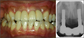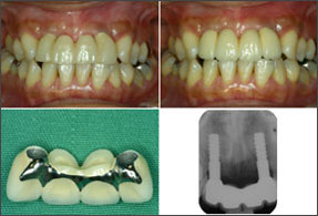![]() 2006/08/23 右上2 植立5Y1M後、左下6 植立7Y11M後、左下7 植立6Y7M後、前歯、臼歯共に審美性を保っている。右上2は、右上1,左上1,2などの天然歯と何ら遜色はない。 |