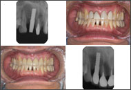 ![]() ?上顎前歯2~2欠損の右上2,左上2に4LMを植立。植立直後にアルジネート印象を採り、翌日洗浄時までにTekを準備する。 |